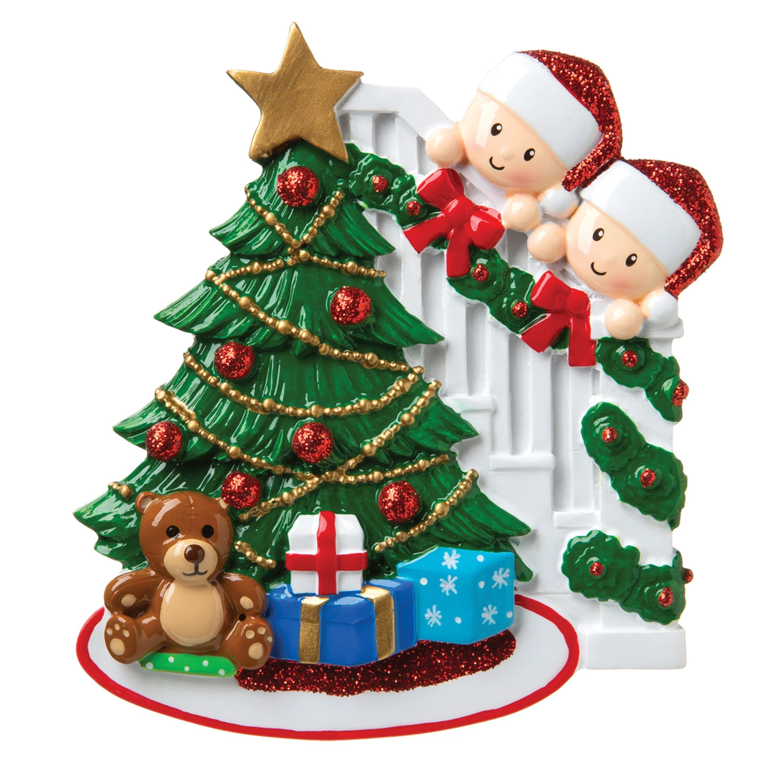 Celebrate Christmas with an ornament you can put the entire family on!! This adorable ornament features a couple gathered around the Christmas tree with Santa hats on, they’re all probably eyeing their Christmas presents eagerly ready to open them! Item #: OR1789-2 Dimensions: 4″ x 3.5″. Made of resin.