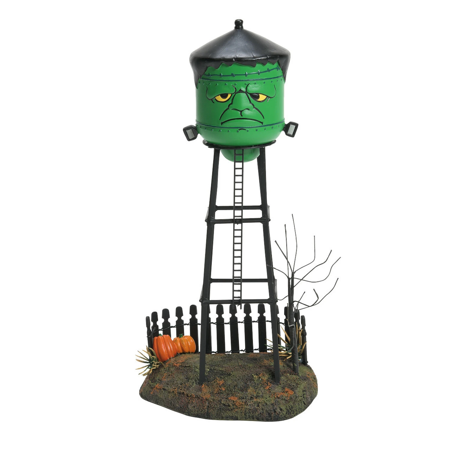 This Frankenstein water tower is a must have for any Halloween village! It features a tall water tower with a green monster face on the tank and bolts coming out of the side! The water tower is fenced in with wonky old fencing and a couple pumpkins grow at the base of the water tower! Introduced January 2021. Made by Department 56. Made of polystone. Dimensions: 11.42 in H x 3.93 in W x 5.51 in L. Item #: 6007706