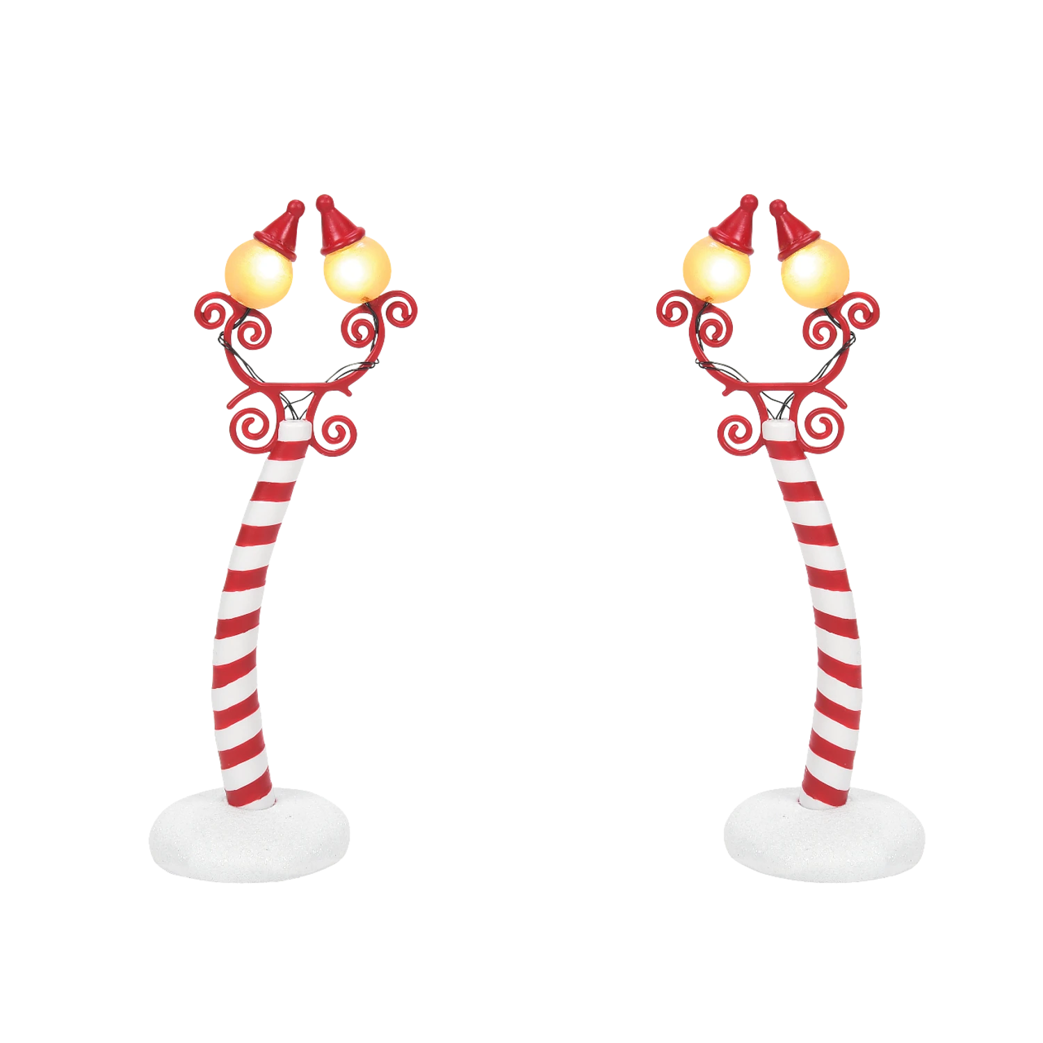 Christmas Town is a bright a colorful place, with playful buildings and accessories around the town- like these street lights! The pair feature wonky street lamps with red and white stripes with bright bulbs! Introduced January 2022. Made by Department 56. Made of resin. Dimensions: 5.25 in H x 1.75 in W x 2 in L. Item #: 6007743