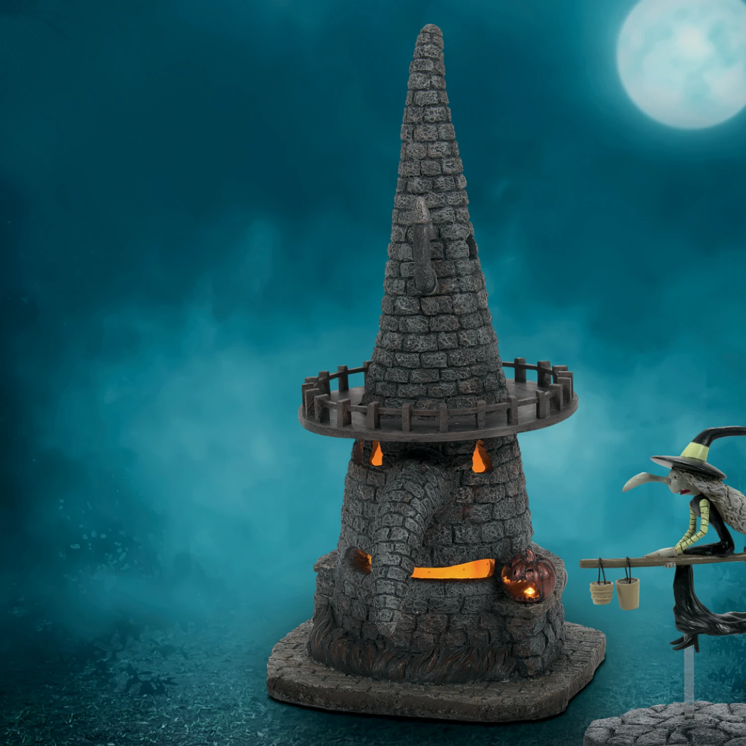 Helgamine is one of the witches that reside in Halloweentown form Tim Burton’s The Nightmare Before Christmas! Her home resembles her with her long witch nose made of grey stones and windows where her eyes and mouth would be. The brim of her hat is the tower’s wrap around balcony porch! The perfect addition to your Halloween village this year! Introduced January 2023. Made by Department 56. Made of resin. Dimensions: 10.3in H x 5.1in W x 5.2in L. Item #: 6012291