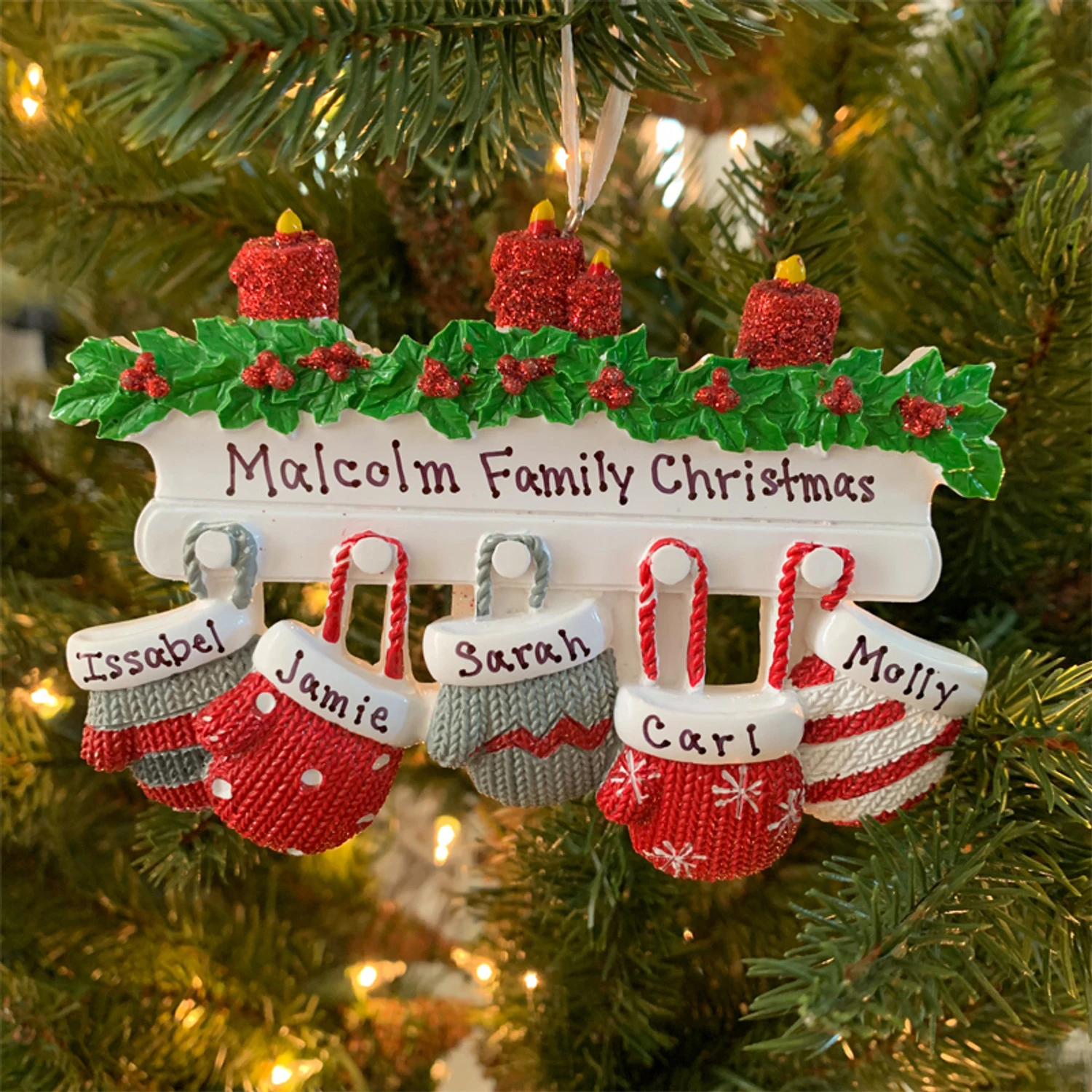 Colorful mittens hang merrily from their hooks in the front hall after a fun day of sledding, snowball fights and snowman building. The shelf above them is decorated with glowing candles and holly garland. Lend this pretty scene to your tree personalized with your family names. Made of resin. Dimensions 5 x 3 1/2 x 1/2. Item KA968-5. No additional charge for personalization.