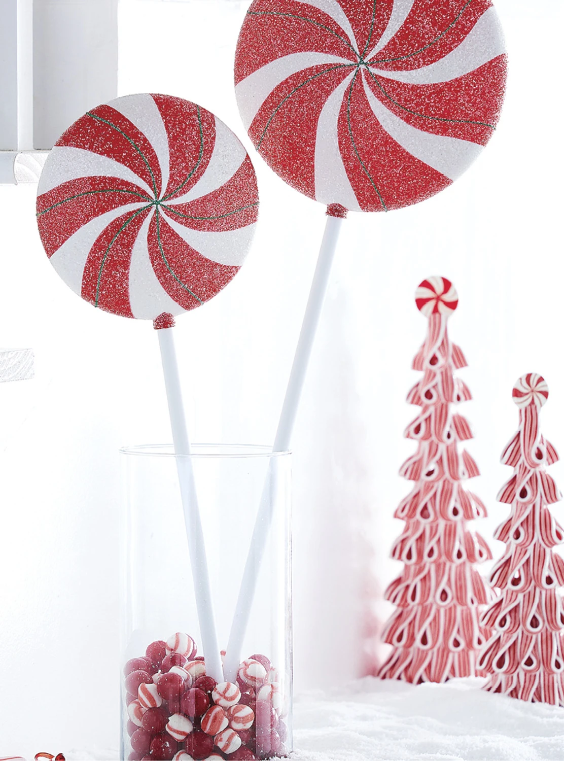 Sweeten up your home with these cutie lollipops! Each one features red and white swirled stripes with a thin green line covered in iridescent glitter! Each sold individually. Made by Raz Imports. Made of plastic. Dimensions: 24″ or 30″. Item # F4214957 or F4214958