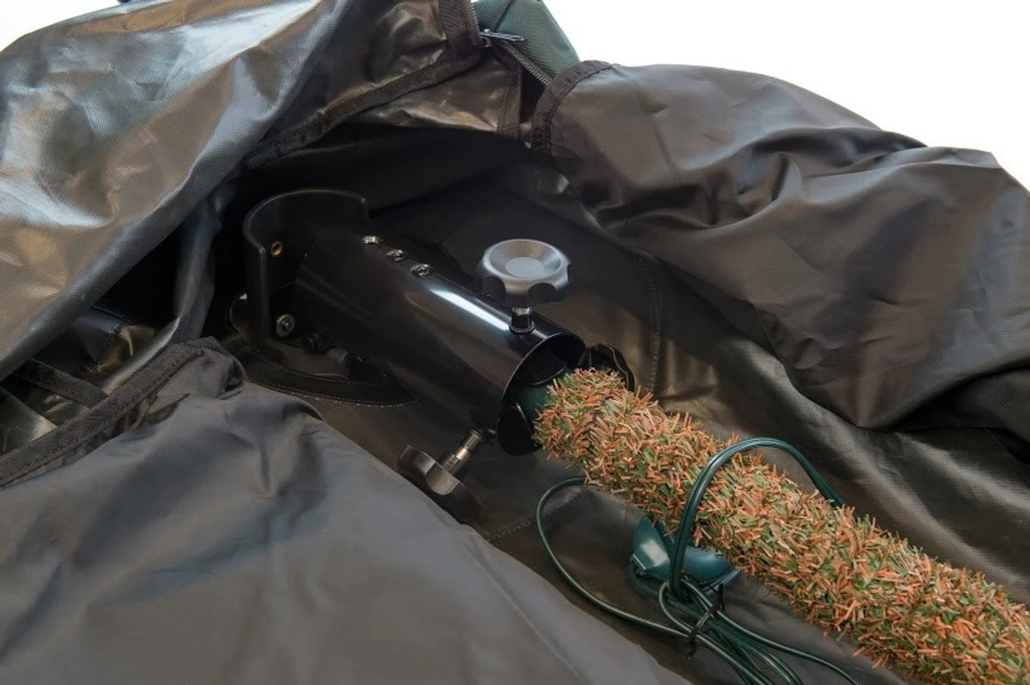 This clever Treekeeper stand is so much more than just a stand for your artificial tree, it is a storage unit with a duffel that compresses to hide under your tree skirt, no one will even know it is there. The stand easily tilts the tree into the bag while staying connected to the stand. Then when the holidays are over, simply take off the tree skirt and pull the duffel up around the tree, zip it up and roll it into storage. If you have an artificial  tree you want to store dust free and crush-free, you need this Christmas storage duffle. Made by Treekeeper. Made of polyester fabric. Dimensions 58″ x 23″ 27″ Hold up to a 9′ Christmas tree. One year warranty against manufacturer’s defects. Item # TK-10709-RS.